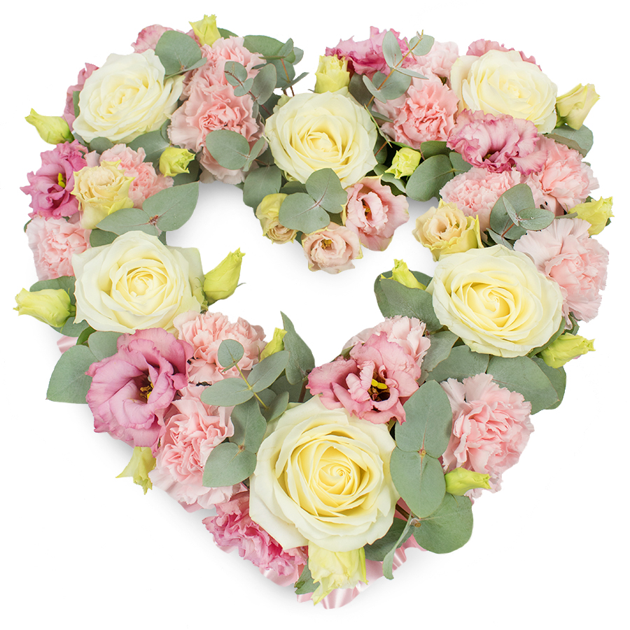 Honor your loved ones with our elegant memorial bouquet. This beautiful arrangement features a thoughtful combination of white roses, pink carnations, pink lisianthus, and eucalyptus leaves, all hand-selected to ensure premium freshness and stunning beauty.